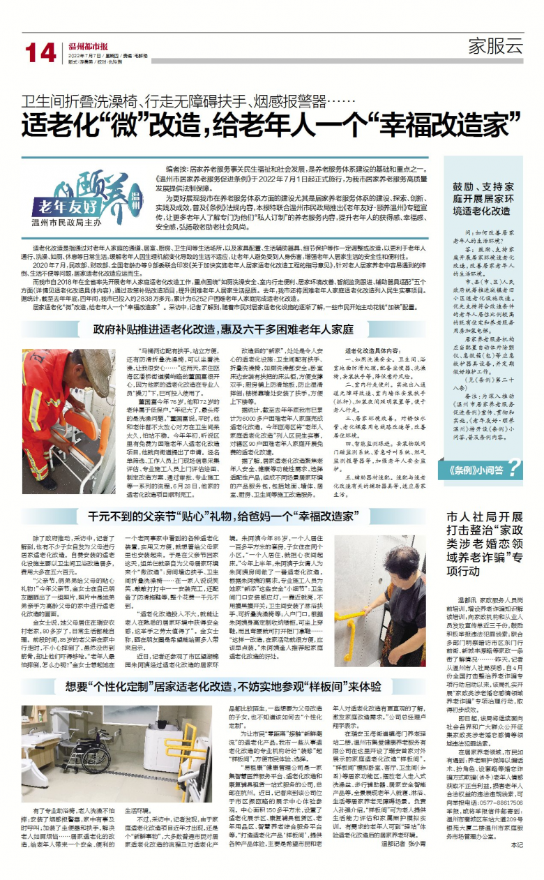 有了专业助浴椅,老人洗澡不怕摔;安装了烟感报警器,家中有事及时呼叫;加装了坐便器和扶手,解决老人如厕烦恼……居家适老化的改造,给老年人带来一个安全、便利的生活环境。