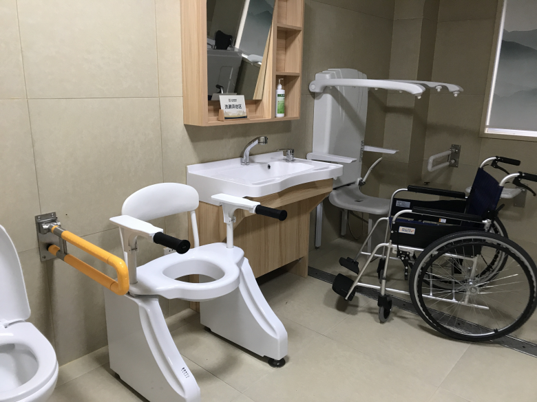 “样板间”模拟卧室、客厅、卫生间(如图)等居家功能区,摆放老人走入式洗澡盆、步行辅助器、居家安全智能产品等,全景展现老年人就寝、淋浴、生活等居家养老无障碍场景。负责人孙强介绍,“样板间”可为老人提供生活能力评估和家属照护模拟实训。有需求的老年人可到“驿站”体验适老化改造后的居家养老环境。
