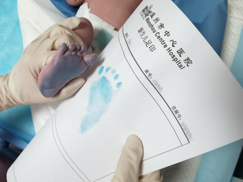 这10分钟里,新生儿要走什么流程?徐丽君介绍,新生儿离开妈妈后,会被助产士抱到一张恒温34℃的保暖台上,先检查婴儿哭声,再确认性别、量体重、清理呼吸道、打乙肝疫苗和维生素K1针等。之后,给新生儿戴上印有妈妈身份信息的手腕带,然后就到了按足印环节。因为采集新生儿足印比掌纹方便,所以在产妇临产之际,助产士会事先准备好新生儿足印单,足印单上有一栏标注着妈妈的床号、住院号,下方须采集新生儿的右足足印和妈妈的左手拇指印。