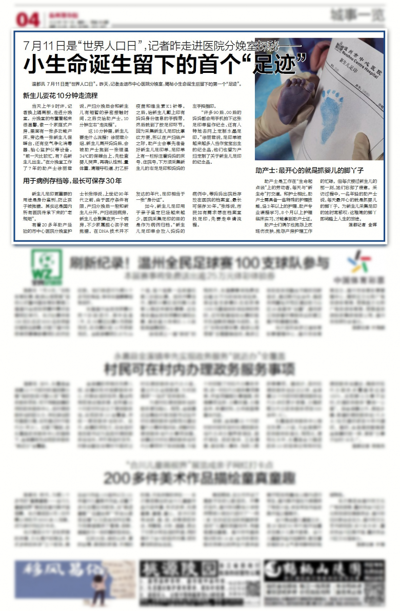 温都讯 人生的足迹,亦是从“走”开始,你可知每个人的第一个脚印,其实是刚出生就留下来的?7月11日是“世界人口日”。今天,记者走进市中心医院分娩室,揭秘小生命诞生后留下的第一个“足迹”。