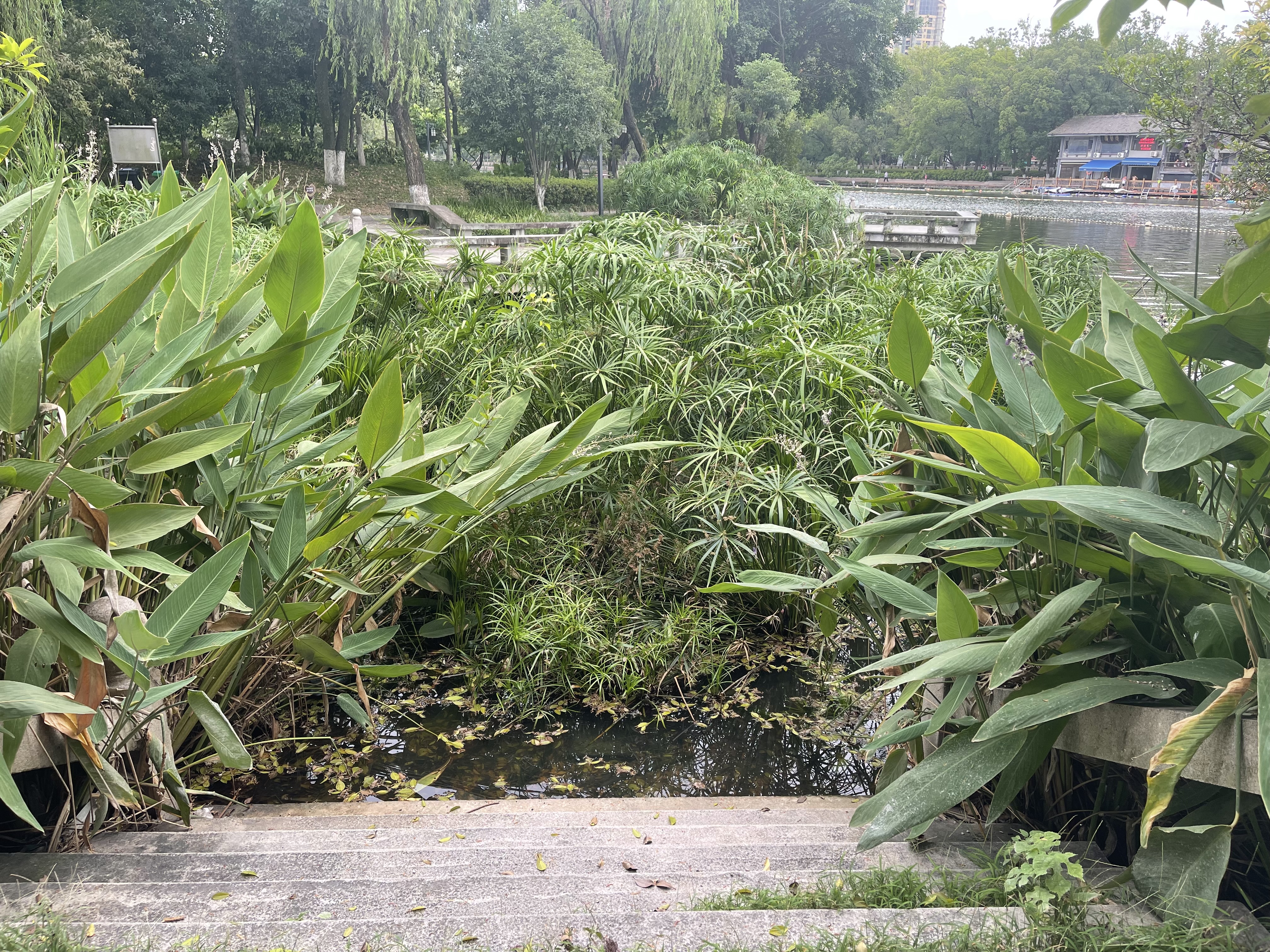 但当记者走完西侧后发现,确实没有直接的路线可以来到九山河步道东侧。于是记者沿着油车巷,绕着九山河南侧走了一段路,发现瓯海公学图书馆遗址似有西侧步道入口。当记者上前时却发现,通往步道的曲桥却已经被污水和茂密的芦苇淹没。于是记者继续从瓯海公学图书馆遗址向东出发,走大约50米左右,看到了一排铁门。在确认这扇门可以通往公园后,记者便继续沿着九山河走,但道路在温州外国语学校九山分校又停止了。