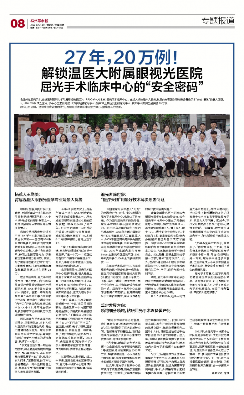 以医带教,以教促医。近二十年来,正是在这样的氛围带动下,屈光手术临床中心逐渐成长为眼视光医院的王牌科室,造福温州百姓。