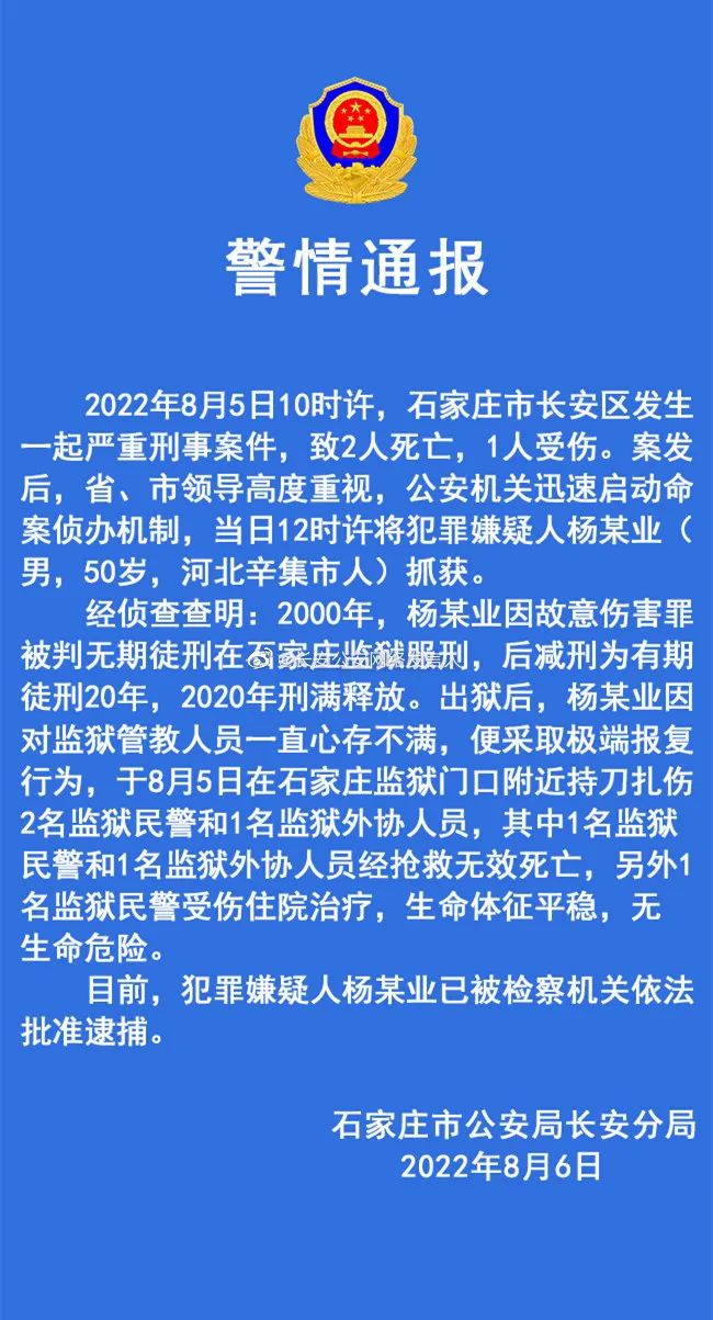 8月6日上午,石家庄警方通报持刀伤人案详情:一男子刑满释放后报复监狱管教人员,一名狱警和一名监狱外协人员抢救无效死亡,目前犯罪嫌疑人杨某业已被检察机关依法批准逮捕。