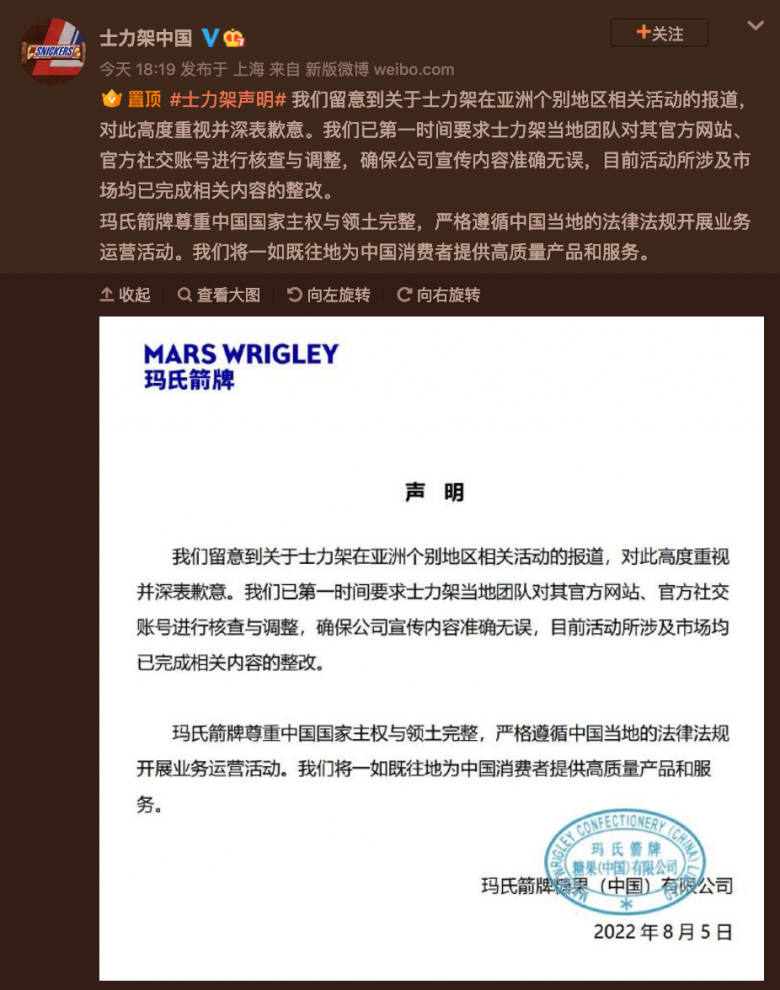 8月5日,@士力架中国 声明称:“我们留意到关于士力架在亚洲个别地区相关活动的报道,对此高度重视并深表歉意。我们已第一时间要求士力架当地团队对其官方网站、官方社交账号进行核查与调整,确保公司宣传内容准确无误,目前活动所涉及市场均已完成相关内容的整改。”
