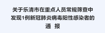 8月9日22时03分,乐清市在重点人员常规筛查中发现1例新冠肺炎病毒初筛阳性感染者,该对象为支援义乌的转运工作人员,经复核阳性。乐清市第一时间启动应急响应机制,迅速开展流调溯源、隔离管控、核酸检测等工作,目前该阳性感染者已闭环转运至定点医院进行规范诊疗。