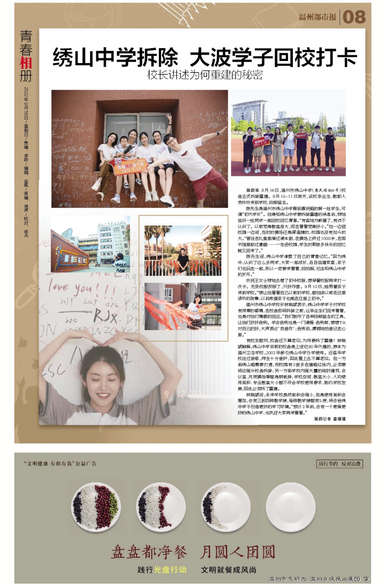 温州市绣山中学校长林晓斌表示,绣山中学学子对学校有深刻的感情,在校舍即将拆除之前,让毕业生们回来看看,也是对他们情感的回应。“我们制作了各种拍照留念的工具,让他们好好告别。学会告别也是一门课程:告别前,想想TA对自己的好,大声表达‘我爱你’;告别后,潇洒地把爱记在心里。”