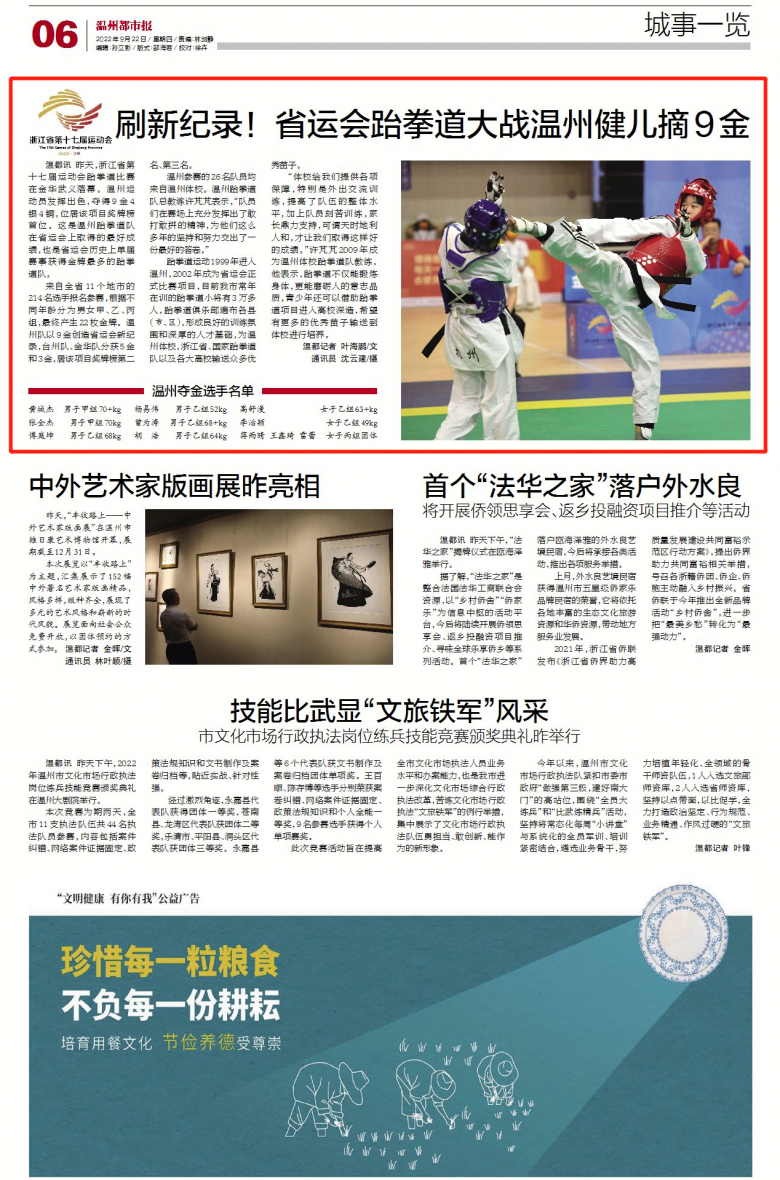 “体校给我们提供各项保障,特别是外出交流训练,提高了队伍的整体水平,加上队员刻苦训练,家长鼎力支持,可谓天时地利人和,才让我们取得这样好的成绩。”许芃芃2009年成为温州体校跆拳道队教练,他表示,跆拳道不仅能锻炼身体,更能磨砺人的意志品质,培养青少年良好的道德品质,并能借助跆拳道项目进入高校深造,希望有更多的优秀苗子输送到体校进行培养训练。