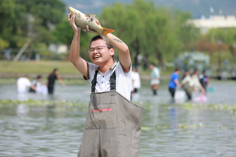 当天中午,大闸一开,明心湖水缓缓下降,岸边的同学早已穿戴完备,跃跃欲试。随着一声“开鱼咯”,湖面瞬间热闹了起来,草鱼、罗非鱼等纷纷被同学们抓入篓中,岸边的师生也举起手机,记录下难得的一幕。