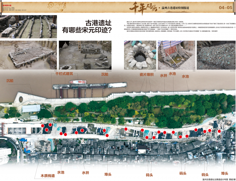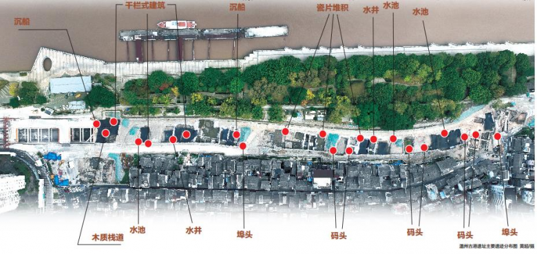 温州古港遗址发现的古城水陆城门相关建筑遗迹、成组码头、砖铺道路、木质栈道、干栏式建筑、水井、灰坑等古代遗迹分布在哪里?来,跟着温都记者,一探究竟吧!