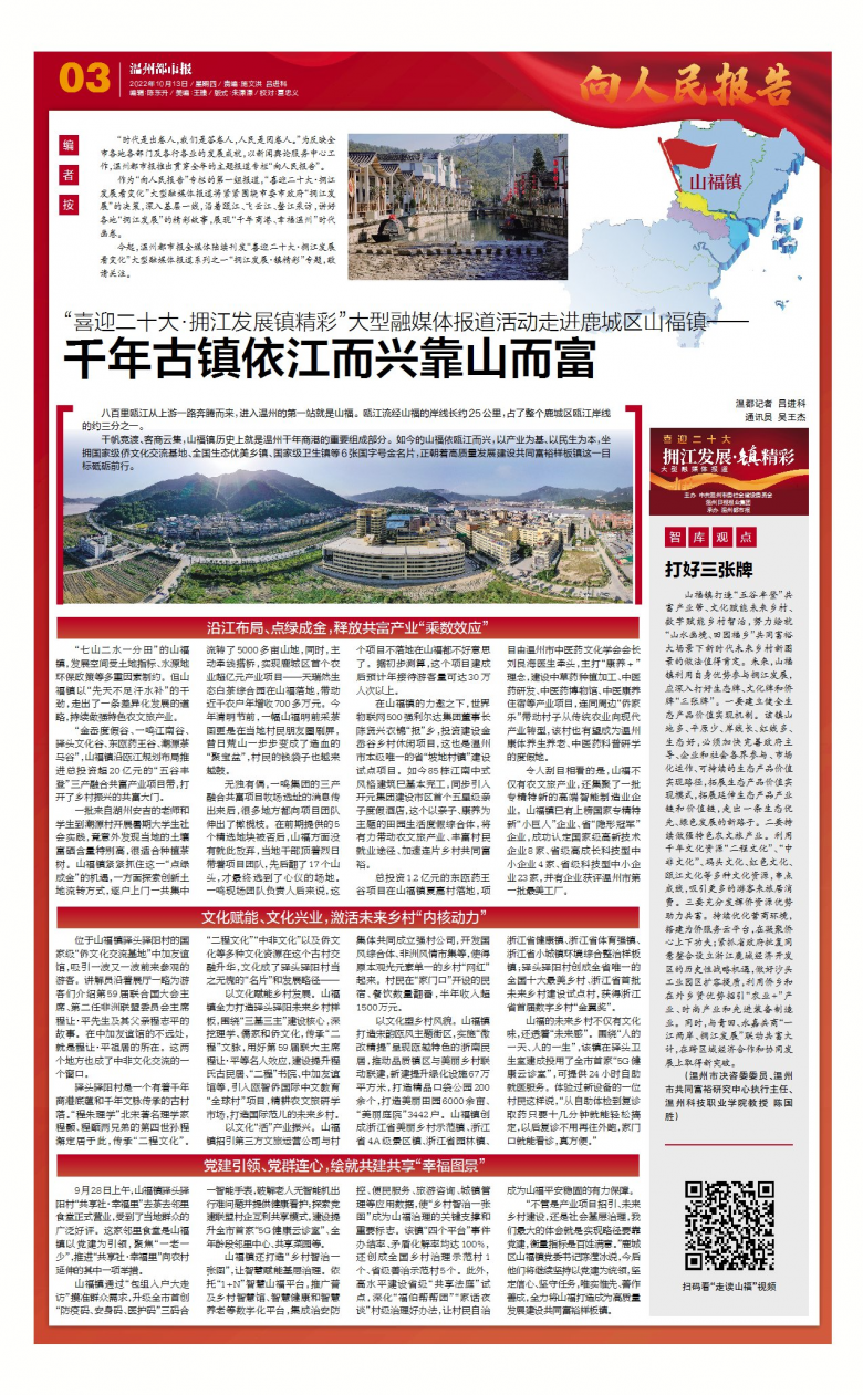 千帆竞渡、客商云集,山福镇历史上就是温州千年商港的重要组成部分。如今的山福依瓯江而兴,以产业为基、以民生为本,坐拥国家级侨文化交流基地、全国生态优美乡镇、国家级卫生镇等6张国字号金名片,正朝着高质量发展建设共同富裕样板镇这一目标砥砺前行。