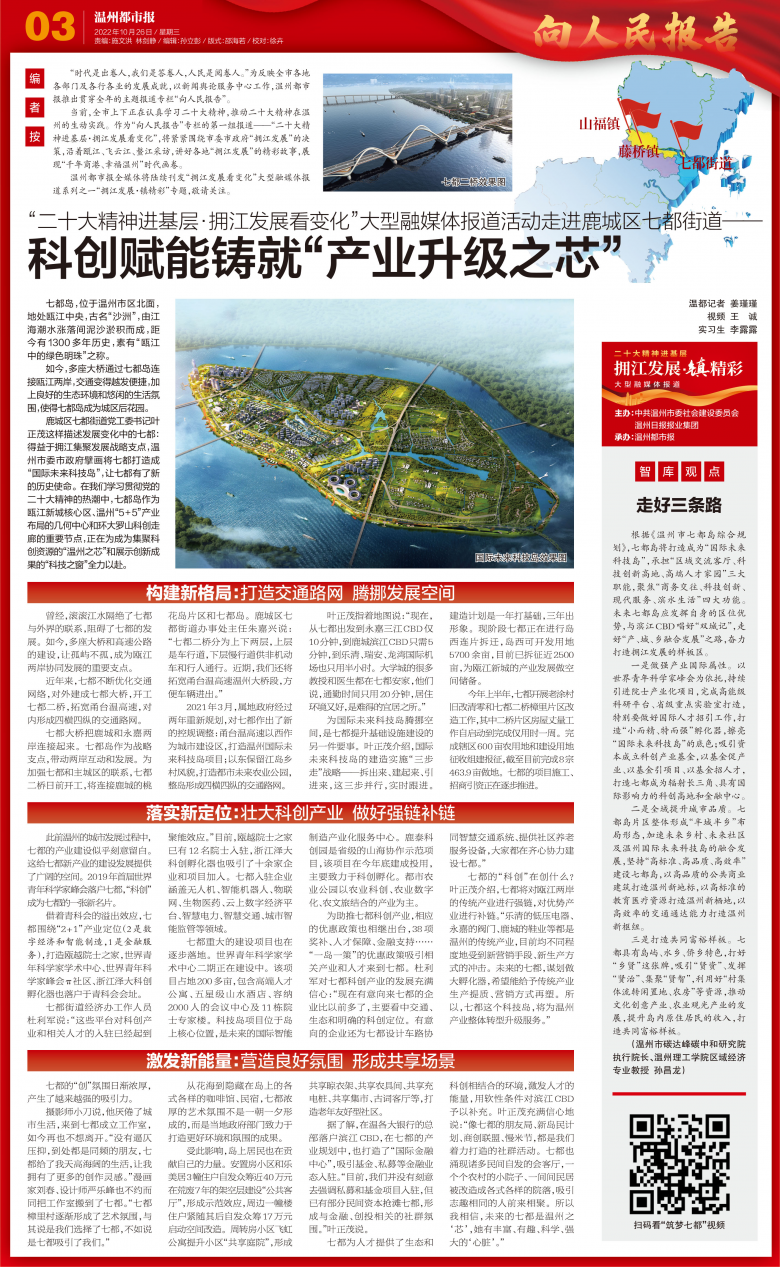鹿城区七都街道党工委书记叶正茂这样描述发展变化中的七都:得益于拥江集聚发展战略支点,温州市委市政府擘画将七都打造成“国际未来科技岛”,让七都有了新的历史使命。在我们学习贯彻党的二十大精神的热潮中,七都岛作为瓯江新城核心区、温州“5+5”产业布局的几何中心和环大罗山科创走廊的重要节点,正在为成为集聚科创资源的“温州之芯”和展示创新成果的“科技之窗”全力以赴。