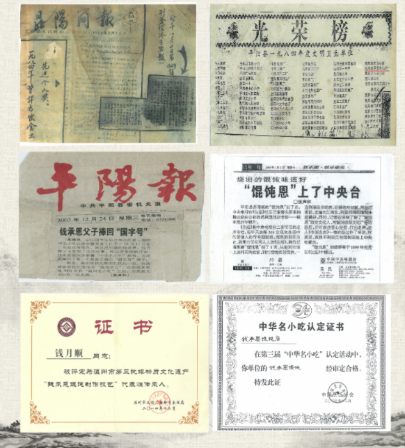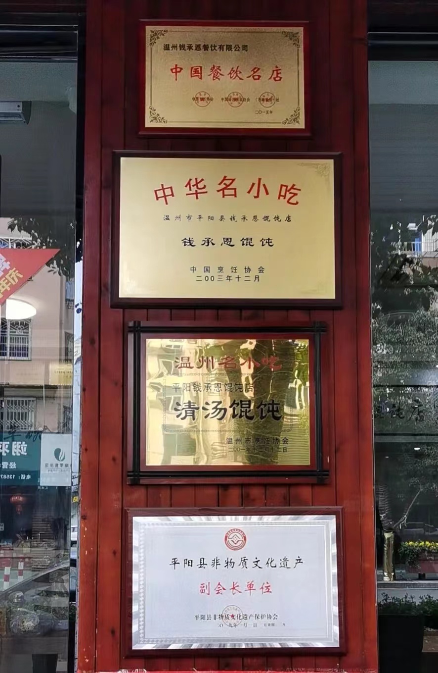 直至今日,钱承恩馄饨仍前行在守正创新路上。而对于他一直以来的努力,社会更是给予了褒奖,多年来,钱承恩馄饨荣获了——温州市非物质文化遗产、首届“温州名小吃"、先进个体经营户、第三届中华名小吃等多项荣誉。