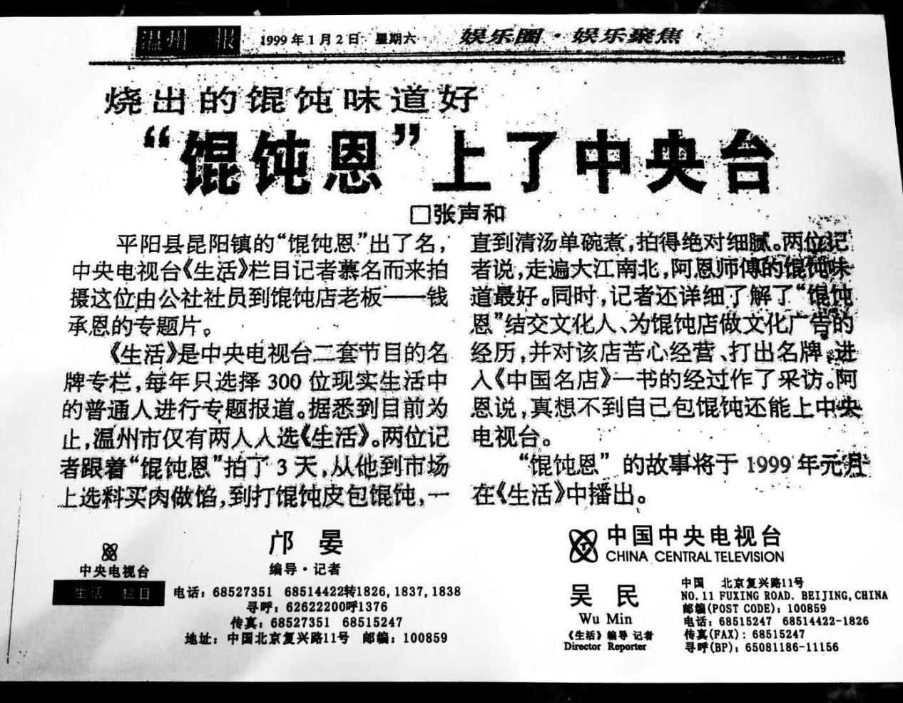 用一碗馄饨抚慰人心,用一份坚守传承信念,历经数年风雨,钱承恩馄饨走出了自己的康庄大道,已然成为温州市非物质文化遗产。