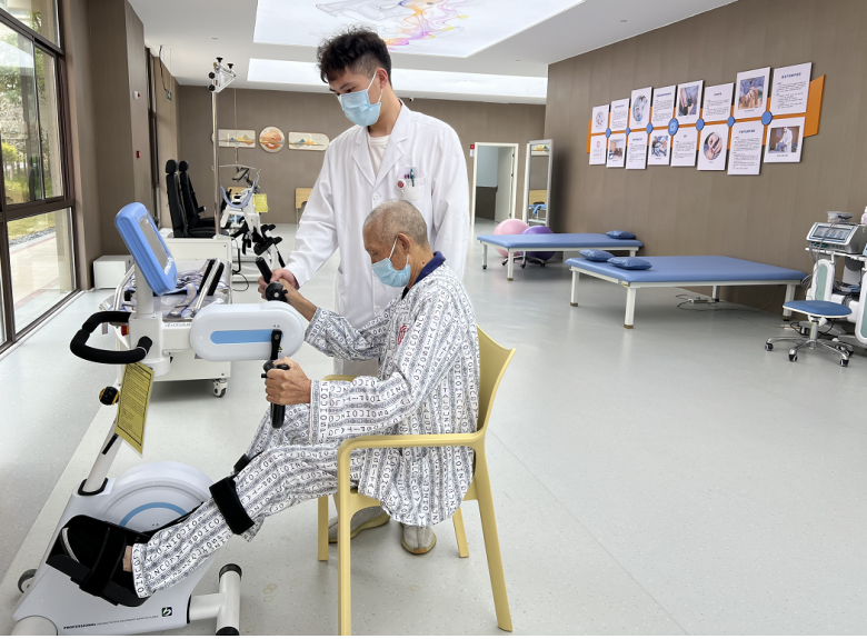 在宽敞的康复中心内,老人在康复师的指导下康复运动