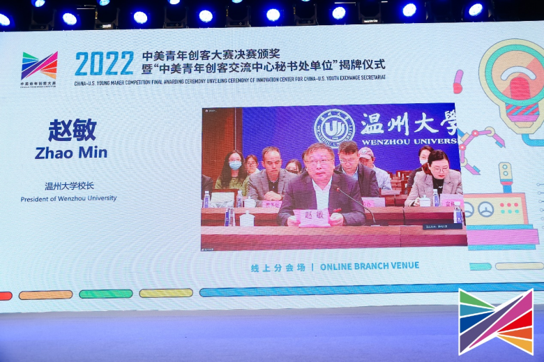 温州大学校长赵敏作为中美青年创客交流中心秘书处单位及唯一受邀高校代表在会上致辞发言。他指出,温州大学是浙南闽北赣东唯一的综合性教学研究型大学,学校于2019年迈进浙江省重点建设高校行列,2021年成功增列为博士学位授予单位。经过20余年的改革与发展,创新创业教育已发展成为温州大学重要办学特色之一,形成了“立足区域、分类分层、专创融合、协同递进”的人才培养新模式,走出了一条具有地方区域特色的创新创业教育新路径,创新创业教育具有示范性和影响力。秘书处单位成立后,温大将在加强资源汇聚、加强活动组织、加强经验推广等方面充分发挥综合优势,为中美双方青年创新创业合作搭建平台,扩大和深化中美人文交流,促进创新创业事业高质量发展。