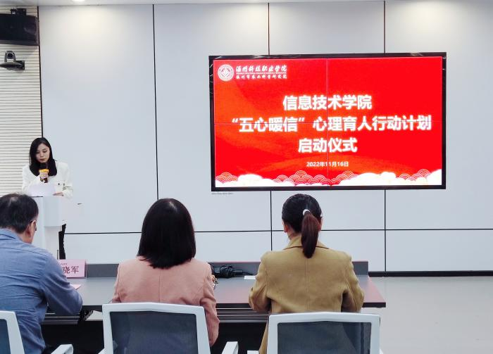 为深入学习贯彻落实党的二十大精神,培育学生自尊自信、理性平和、积极向上的健康心态,2022年11月16日下午,温科院信息技术学院举行“五心暖信”心理育人行动计划启动仪式,促进学生心理健康素质与思想道德素质、科学文化素质协调发展,提升心理育人实效。温科院学生处副处长李丽莉、心理健康中心主任王娟、信息技术学院院长崔晓军、党总支书记饶细丽、副书记魏燕、相关班主任与辅导员参与此次活动。