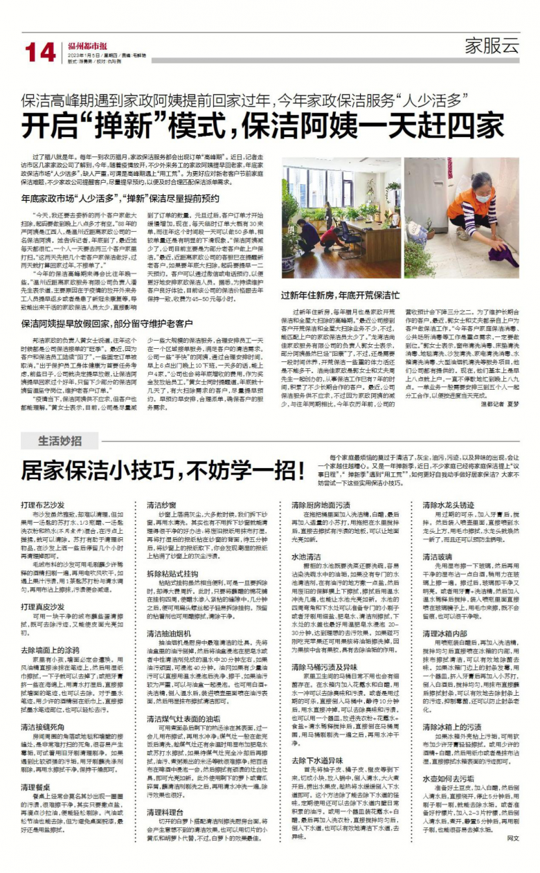 过新年住新房,每年腊月也是家政开荒保洁和全屋大扫除的高峰期。“最近公司接到客户开荒保洁和全屋大扫除业务不少,不过,能匹配上户的家政保洁员太少了。”龙湾洁尚佳家政服务有限公司的负责人郭女士表示,部分阿姨虽然已经“阳康”了,不过,还是需要一段时间休养,开荒保洁一些重的体力活还是不能多干。洁尚佳家政是郭女士和丈夫周先生一起创办的,从事保洁工作已有7年的时间,积累了不少长期合作的客户。最近,公司保洁服务供不应求,不过因为家政阿姨的减少,与往年同期相比,今年农历年前,公司的营收预计会下降三分之二。为了维护长期合作的客户,最近,郭女士和丈夫都亲自上户为客户做保洁工作。“今年客户家庭保洁消毒、公共场所消毒等工作是重点需求,一定要做到位。”郭女士表示,窗帘清洗消毒、床垫清洗消毒、地毯清洗、沙发清洗、家电清洗消毒、水箱清洗消毒、大型油烟机清洗等服务项目,他们公司都有提供的。现在,他们基本上是早上八点就上户,一直不停歇地忙到晚上八九点。一单业务一般需要安排三到五个人一起分工合作,以便按进度当天完成。