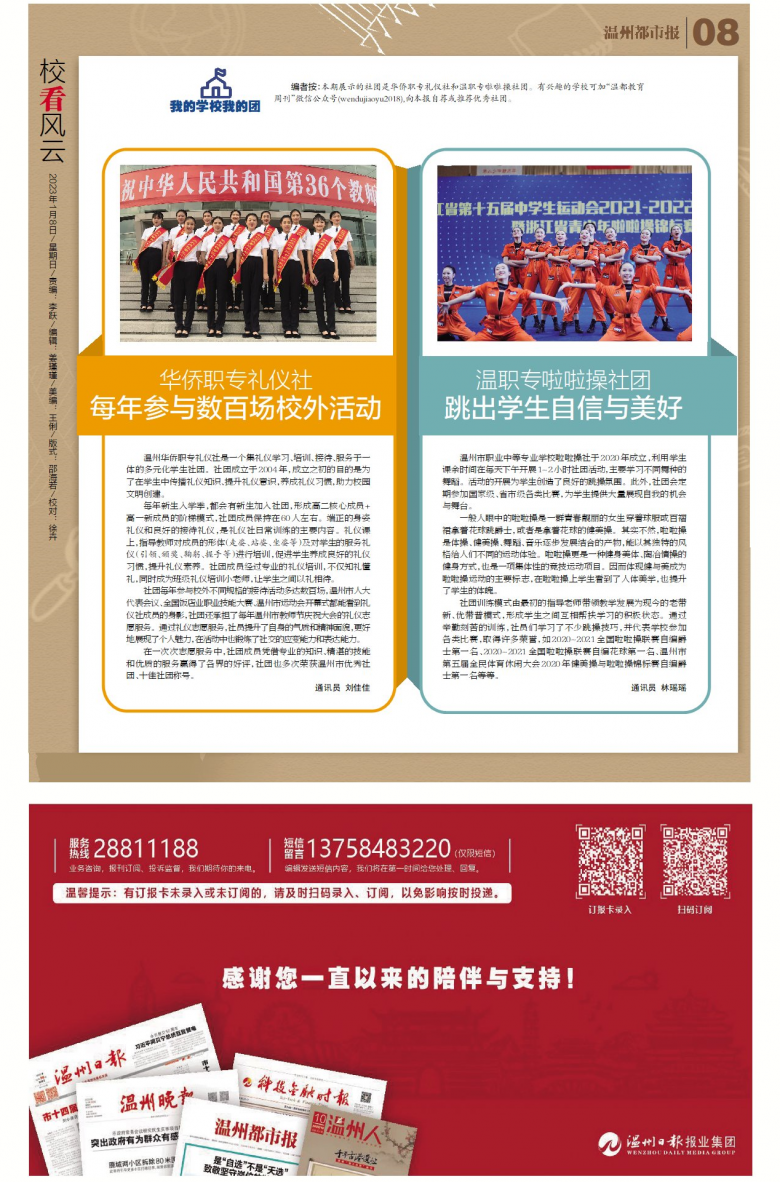 编者按:本期展示的社团是华侨职专礼仪社和温职专啦啦操社团。有兴趣的学校可加“温都教育周刊”微信公众号(wendujiaoyu2018),向本报自荐或推荐优秀社团。