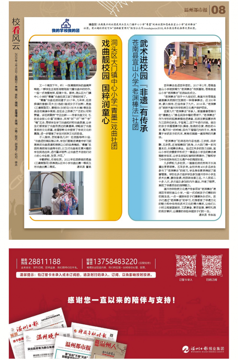 编者按:本期展示的社团是洞头区大门镇中心小学“青墨”戏曲社团和苍南县宜山小学“老渊棒法”社团。有兴趣的学校可加“温都教育周刊”微信公众号(wendujiaoyu2018),向本报自荐或推荐优秀社团。
