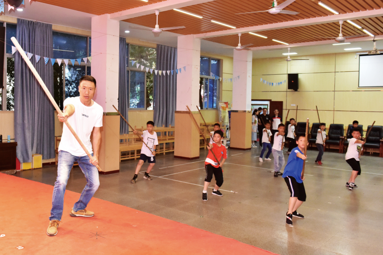 在第九代“老渊棒法”传承人、首届健康苍南行动“健康达人”提名奖陈中墙的带领下,“老渊棒法”作为学校的拓展课程走进课堂,社团主要招募学员为三四年级学生,于每周二、四下午进行训练。练功的孩子手握棍棒列队操练,饱满的态度、昂扬的斗志、整齐划一的呐喊、阳光下熠熠闪光的汗水,是独属于学武孩子的风采,更是校园里一道独特的风景线。