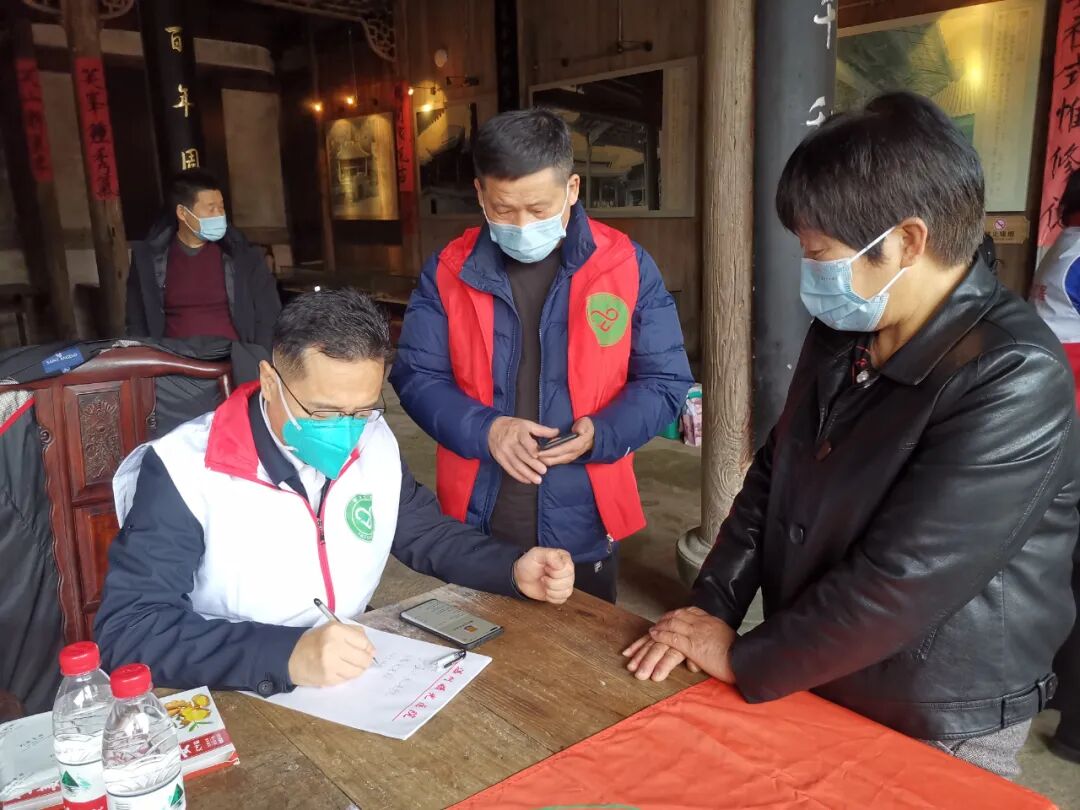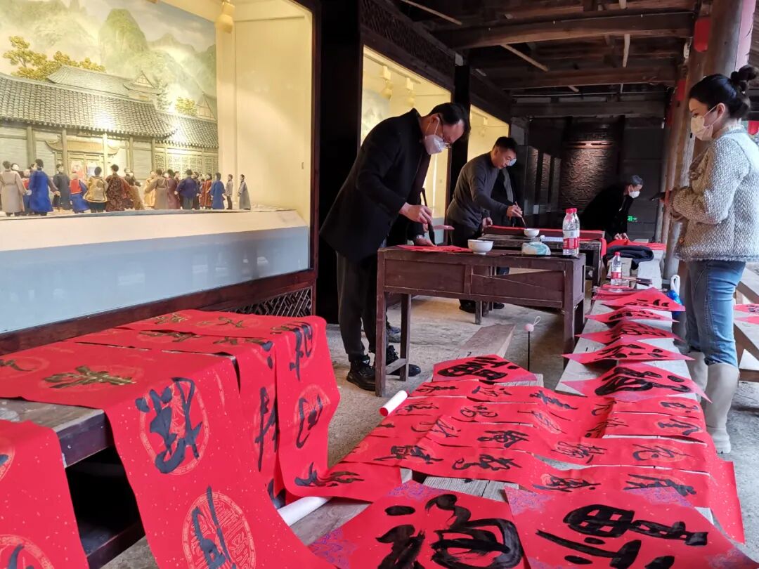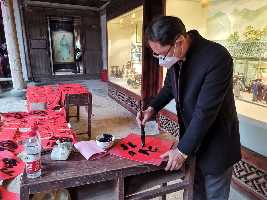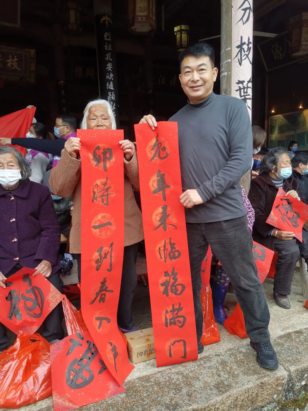 “卯时一到春入户,兔年来临福满门”,温州楠溪第一楼餐饮董事长、温州市书法家协会会员金育林和温州丝绸之路文化艺术有限公司董事长吴琪雷,在现场为村民写春联,一个上午送出100多副春联和福字。一副副红彤彤的春联,字字喜气洋洋,寓意吉祥美好,阿公阿婆们拿着春联,笑着连连道谢。