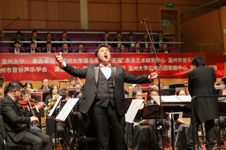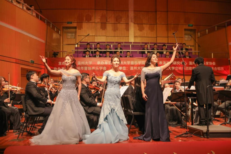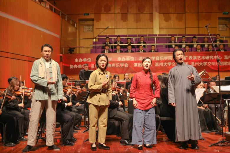 近年来,温州大学充分挖掘艺术独特的思想政治教育功能,探索艺术思政化、思政艺术化的创新路径,打造综合性大学“艺术+思政”融合教育体系,以艺术之实提升教学内涵,以艺术之行丰富育人实践,以艺术之美浸润时代新人。比如由温州市委宣传部、温州大学和瑞安市委联合出品的创编原创歌剧《五星红旗》获第四届中国歌剧节优秀剧目和国家艺术基金项目。该剧以温州大学音乐学院、温州大学交响乐团为主要演出班底,温州大学师生在各类演职人员中充当骨干,在长达3年时间的创、排、演过程中,追忆国旗往事、赓续红色精神,努力弘扬勇于担当、矢志不渝的革命精神与爱国情怀。温州大学音乐学院与市文广旅局、市文联共同成立了“天瑞”表演艺术研究中心,构筑温州表演艺术高地,为温州打造新时代文化高地,加快建设“千年商港、幸福温州”贡献文艺智慧和力量。