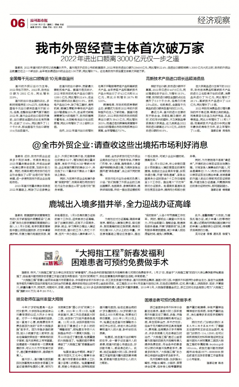 浙江省医学会手外科学分会副主任委员、温医大附二院手显微外科副主任丁健说,多指、并指等四肢先天性肢体畸形是可治之病,早发现早治疗,手术疗效好。但由于先天畸形的矫正具有难度大、费用高、经常需多次手术等特点,许多贫困患儿无法得到及时治疗,“大拇指工程”通过公益慈善为困难的四肢先天性畸形患儿提供免费救助,符合条件的患者可以预约来温州免费做手术,患者多的地方,“大拇指工程”主办单位将组织全国专家去做手术。