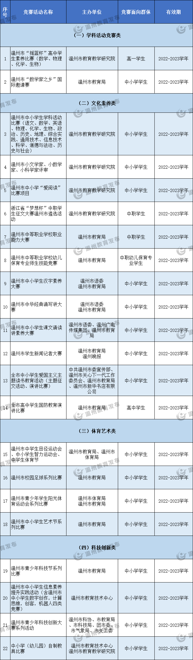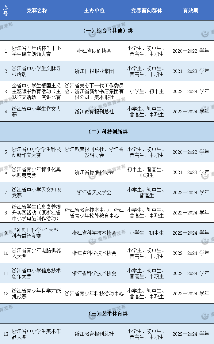 为推进素质教育,切实减轻中小学生过重课业负担,维护正常教育教学秩序,进一步规范管理面向中小学生的全市性竞赛项目,近日,温州市教育局下发《关于公布面向中小学生的全市性竞赛项目的通知》。