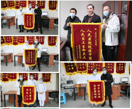 “人民至上 生命至上”“为病人着想 为人民服务” “医术精湛 情暖人心”“妙手扶桑梓 高医攀手峰” “疫情无人情人有情 精心照护胜亲人”,患者家属手捧着5面锦旗,眼里满是激感……2月27日,在温州市人民医院出现这样的一个感人的场景:“大白肺”陈奶奶救治成功逐渐康复,其儿子分别将锦旗送至院办、呼吸与危重症学科、康复科、重症医学科李钰副主任医师团队、朱秀若护士长团队,并一一向医护人员握手致谢。