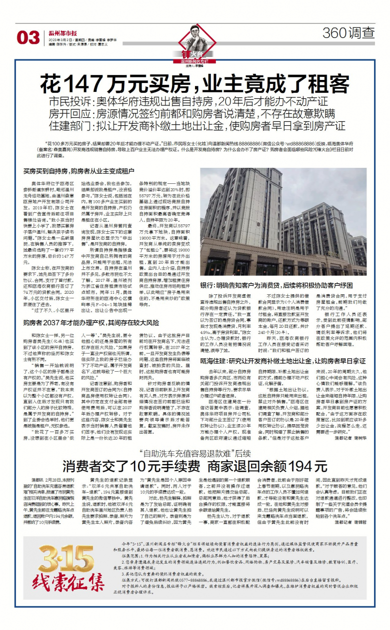 “花100多万元买的房子,结果却要20年后才能办理不动产证。”日前,市民陈女士(化姓)向温都新闻热线88868886(微信公众号:wd88868886)反映,瓯海奥体华府(备案名:森奥嘉苑)开发商违规销售自持房,导致上百户业主无法办理产权证。什么是开发商自持房?为什么会办不了房产证?购房者会面临哪些风险?《锋火台》栏目日前对此进行了调查。