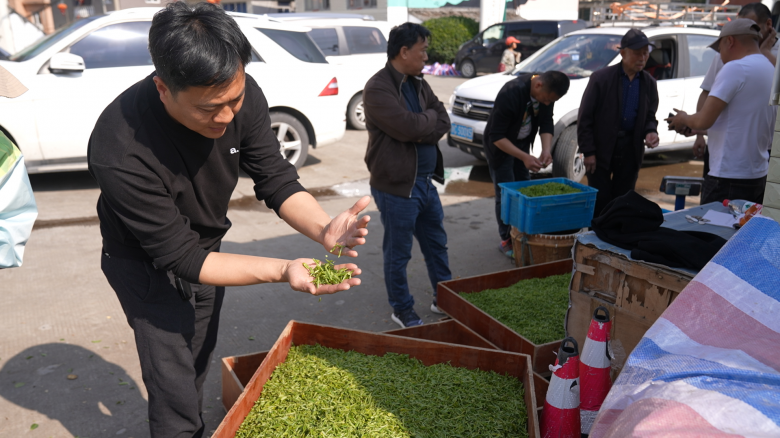行禅村的广场则聚满了前来收购茶青的茶商,一扫疫情期间的沉寂景象。农户将采来的新鲜茶叶装在透气的网兜里,几名茶商凑上前,用手抄起,凑近拨开细看,报出一个价格,成交后,这些茶青将被运往工厂连夜制成干茶叶,销往全国各地。