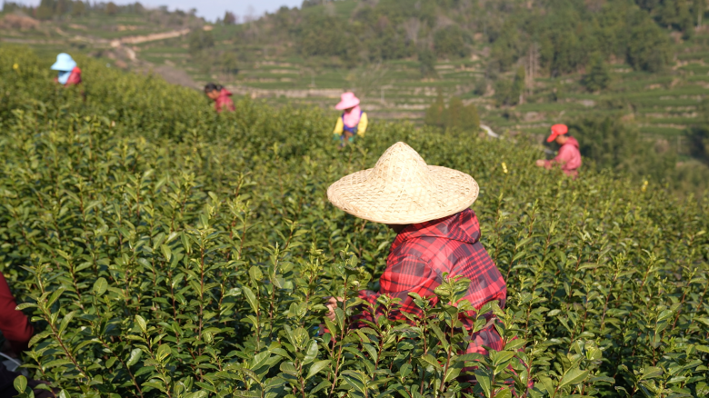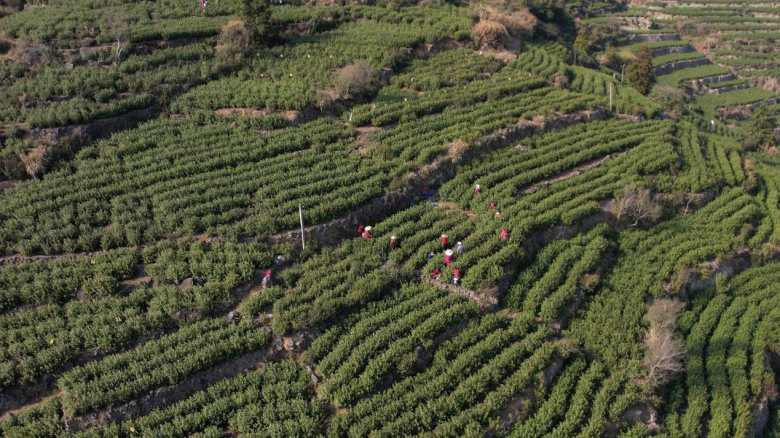 在永嘉县三江街道行禅村,海拔近500米的高低错落的茶园梯田里,身穿彩服,头戴斗笠的采茶工人正在忙碌今年“乌牛早”的采摘尾季。“今年2月下旬气温陡增,温度一高,茶叶就长得快,到现在已经采摘了20多天了。”行禅村村委会副主任叶新标说。