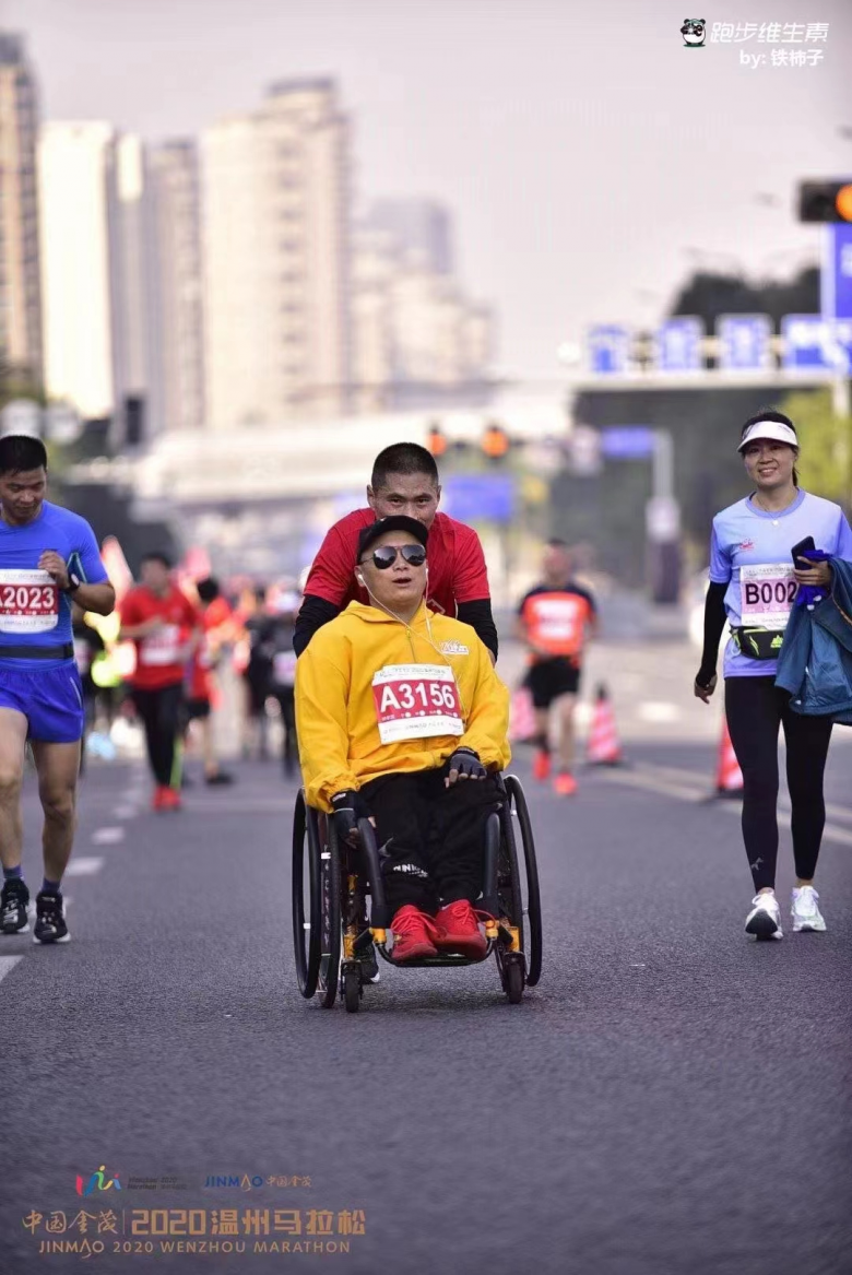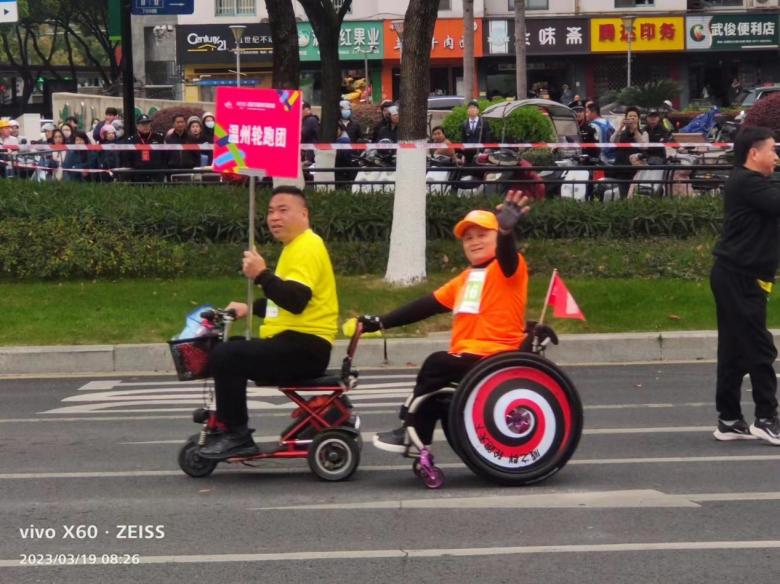 温州轮跑团团长47岁的林孝波参加此次温马欢乐跑项目,“轮跑中,很多跑友都会帮助我上坡,让我很感动。”他表示,这次温马特别热闹,很多人都给他加油鼓劲。林孝波是瑞安人,从事残疾人运动器械售卖等相关工作,业余他就喜欢组织跑友轮跑训练,他目前1公里轮跑7分钟左右,有的团员可达每公里4分钟左右。可别小瞧了这群特殊的参赛者,为了参加马拉松赛事,这些残疾人都配备有特殊的运动轮椅,相比普通轮椅,更加轻便灵活,且适合手臂发力,质地也更加坚韧。林孝波介绍,温州轮跑团大部分参赛队员都有日常训练,并有多次参加马拉松等赛事的经历。年龄最小的有18岁,最大的有60多岁,一般轮跑距离多在5公里至10公里内。