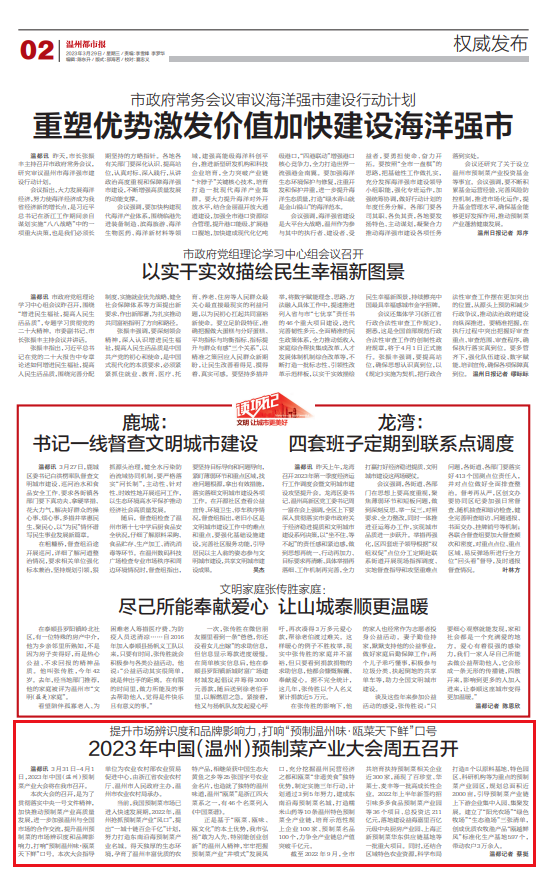 温都讯 3月31日~4月1日,2023年中国(温州)预制菜产业大会将在我市召开。