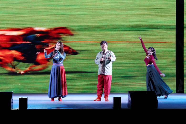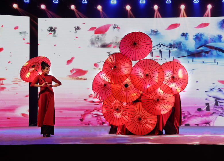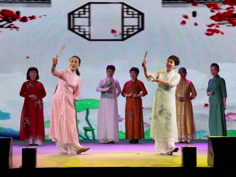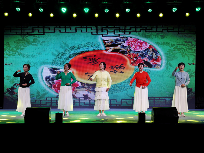 身穿不同民族服装的中老年人,豪迈奔放的舞姿、色彩亮丽的服饰载歌载舞。紧接着,旗袍秀《醉红颜·踏古》,十来位平均身高1.67米的时尚奶奶身穿酒红色旗袍,踏着音乐旋律,变换着各种队型走秀,手上撑着红色的油纸伞,时而收拢、时而绽放,变化出各种造型,融合了舞蹈的优美,观众直呼“太美”了。据了解,这个走秀节目的配音融合了5首曲子,每一段都有不同的节奏,时尚奶奶们随机切换着不同的走步和舞姿,配上雨伞开合,舞台效果美轮美奂。随后,男女生对唱《敖包相会》、小组唱《迎亚运——赛龙舟》、民歌联唱《水韵》,演员们凭借实力的唱腔和超强的气场,赢得台下观众阵阵掌声。