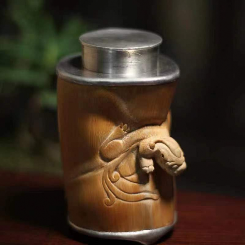 在作品创作上,他主张师古出新。这些年人们开始注重养生,于是他开发了各种各样的茶叶罐,有纯锡的,有结合东阳木雕、根雕、竹编等不同材料制作的。他还开发了一系列非遗文创产品,像紫光檀包锡茶叶罐,将紫光檀的奢华大气与锡的温润光泽完美融合,被评为2017年东阳十大旅游纪念品;“思恭”款嵌木雕锡罐获2018年义乌市工艺美术展银奖、2019年义乌文博会银奖。