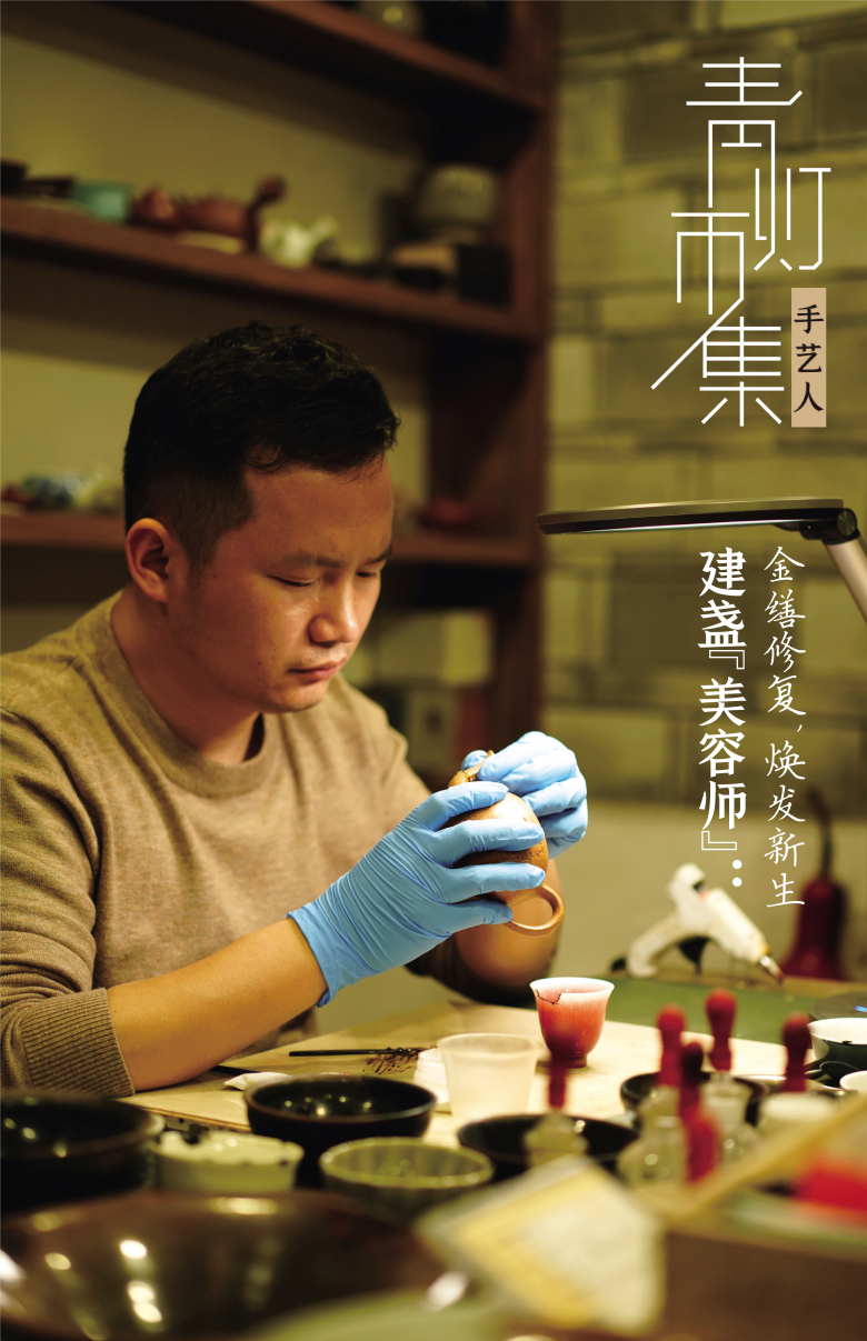 “金缮,可以理解为天然的大漆,把破损的瓷器捏合在一起,再用金粉黏合修饰,达到美观的效果。”严金文说,大学专业学的是漆艺,上课时了解到金缮这门修复艺术。