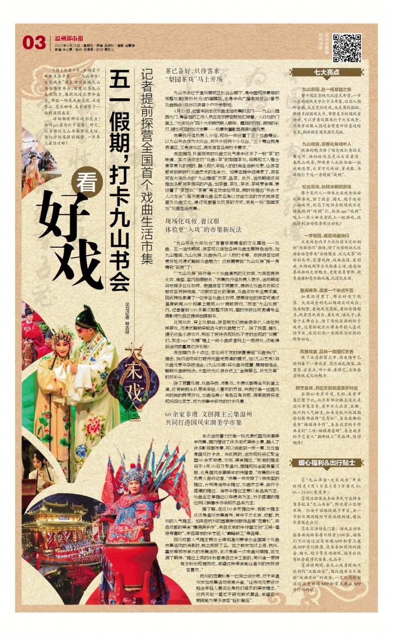 5月1日至3日,全国首个戏曲生活市集——“九山书会·大宋戏仓”将在温州鹿城九山书会隆重举办,深度还原九山文化魅力、展现沉浸式繁华盛景,开启一场集戏曲文化、非遗手工、茶点咖啡、美食游乐于一体的梨园盛宴。