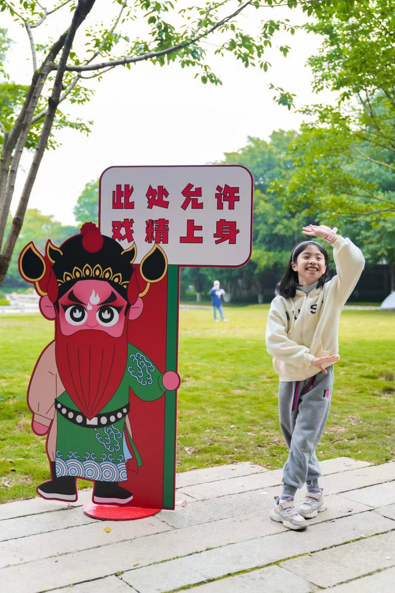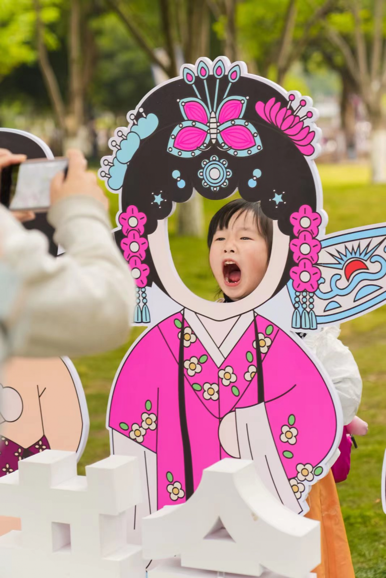 5月2日上午9时30分许,5岁的小女孩何以旋便在奶奶的带领下,来到九山书会现场“赶集”。“快点站过去,站在那个小娘子后面,奶奶给你拍个照。”在奶奶的指引下,何以旋蹑手蹑脚地走到人物展示板后面,配合着摆弄表情。何以旋奶奶说,她们是附近的居民,经常到九山公园散步,但这次戏曲生活市集活动让她眼前一亮,“以前没有接触过南戏,自己也不太懂。这种互动方式很直接,也能让小朋友体验到戏曲文化的魅力。”