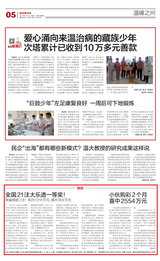 5月8日,体彩大乐透第23051期开奖,当期全国中出21注一等奖,单注奖金600万元,其中15注追加投注,每注多得追加奖金480万元,有12注符合派奖条件,额外获得派奖奖金124万元。
