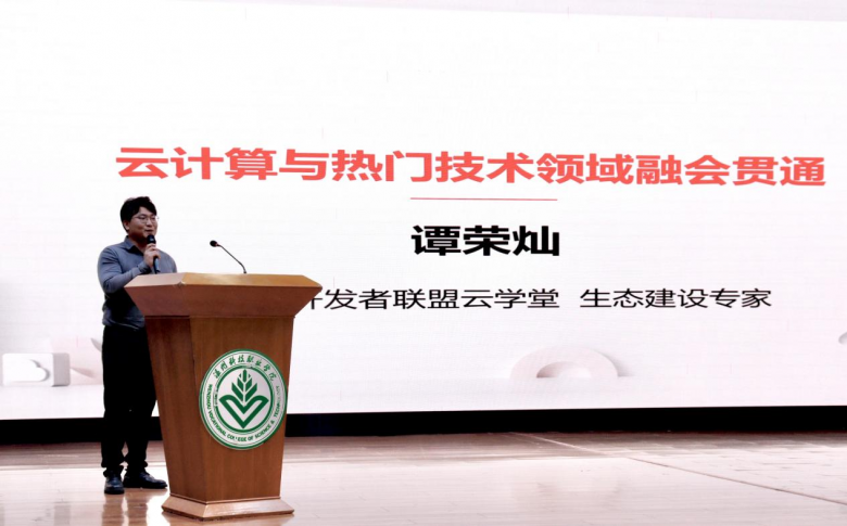 谭荣灿做《云计算与热门领域技术融会贯通》主题宣讲。他向师生们介绍了云计算在当前热门领域的具体运用,分析如何通过物联网生产价值增值以及如何利用IoT结合AI的方式更好地提供具体需求场景的解决方案,并重点介绍了华为云开发者认证体系、认证流程以及作用。