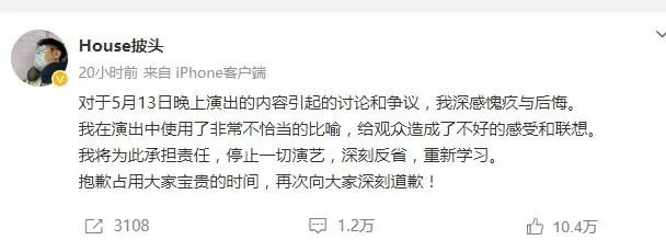 5月16日18时许,新华社发布微博:人民军队保家卫国,每个人都必须敬畏;“听党指挥、能打胜仗、作风优良”,每个字都不容冒犯!9年时间,凭借《吐槽大会》《脱口秀大会》两大爆款综艺,笑果文化几乎成了脱口秀的代名词。流量加持之下,版图亦不断扩大——如今,旗下拥有李诞、王建国、庞博、杨笠、徐志胜等多位脱口秀演员,线下则开设自营脱口秀剧场“笑果工厂”。资本同样嗅到商机,并押宝这一赛道。根据公开披露信息,2016年至2021年笑果文化共完成8轮融资。HOUSE作为笑果文化旗下脱口秀演员,曾因《脱口秀大会》而被观众所熟悉。去年的《脱口秀大会》第五季,HOUSE在表演中讲了自己炒股的一段经历,竟直接导致一支股票涨停。此前,李诞曾因微博广告文案陷入争议,其在宣传某女性内衣品牌时将“躺赢职场”写入文案,涉嫌存在物化、矮化甚至歧视女性的倾向,构成广告违法行为并被罚款。2020年6月,笑果旗下另一艺人卡姆因吸毒被上海警方拘留。据媒体报道,和其一起吸毒的,还包括两名友人,也是笑果旗下的编剧。在今年3月,笑果文化还签署了《新时代网络视听行业爱国为民崇德尚艺承诺书》。同时在2022年底,包括笑果文化等13家国内优秀脱口秀俱乐部,在中国演出行业协会的指导下,共同发布了《促进脱口秀演出市场规范发展倡议书》,呼吁全行业共同发掘培养喜剧人才、规范脱口秀培训市场、规范演出经营行为等,以推动脱口秀演出市场有序发展。