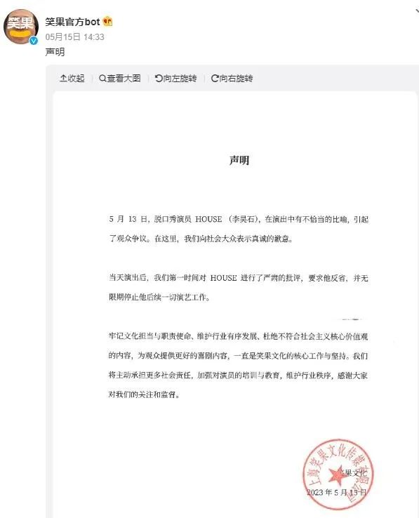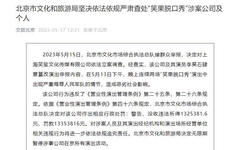 据北京市文化和旅游局微信消息,2023年5月15日,北京市文化市场综合执法总队接群众举报,决定对上海笑笙文化传媒有限公司依法立案调查。经查实,该公司及其演员李昊石肆意篡改演出申报内容,在5月13日下午、晚上连续两场“笑果脱口秀”演出中出现严重侮辱人民军队的情节,造成恶劣社会影响。北京市文化和旅游局表示,该公司行为违反了《营业性演出管理条例》第二十五条、第二十六条规定。依据《营业性演出管理条例》第四十六条规定,北京市文化市场综合执法总队决定对该公司作出相应行政处罚:警告、没收违法所得1325381.6元、罚款13353816元。对涉案人员及其演出经纪机构和演出场所经营单位相关违规行为将进一步依法依规追究责任。北京市文化和旅游局决定无限期暂停涉事公司在京所有演出活动。人民军队是守卫国家安全、守护人民安宁的坚强卫士,我们绝不允许任何公司和个人在首都舞台肆意诋毁人民军队的光辉形象,绝不允许伤害广大人民群众对子弟兵的深厚感情,绝不允许把严肃题材娱乐化。我们将坚持强化监管、严格执法,坚决抵制只求“笑果”不计后果、只讲经济收益不讲社会责任的行为。希望广大文艺工作者遵守法律法规,端正创作思想,加强道德修养,自觉讲品味、讲格调、讲责任,为人民群众提供有营养的精神食粮。5月17日,据北京商报报道,原定于5月17日-18日举行的2场笑果脱口秀演出取消,退票事宜后续根据笑果小程序或票务平台发布。就旗下艺人在演出中的不当言论,笑果文化15日发布道歉声明,称将无限期停止HOUSE(李昊石)演艺工作。而脱口秀演员HOUSE,因在脱口秀现场表演中出现不当言论,目前个人微博被禁言。
