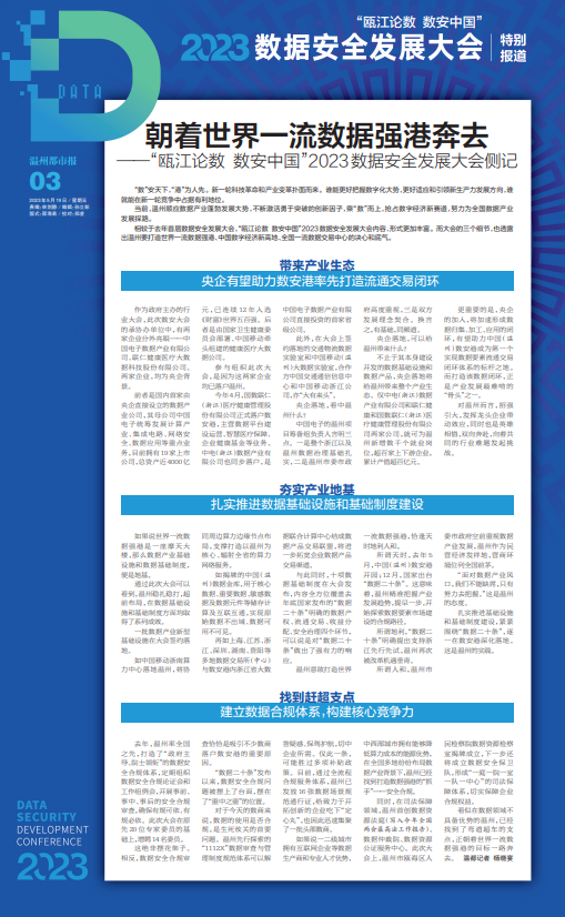 当前,温州顺应数据产业蓬勃发展大势,不断激活勇于突破的创新因子,乘“数”而上,抢占数字经济新赛道,努力为全国数据产业发展探路。