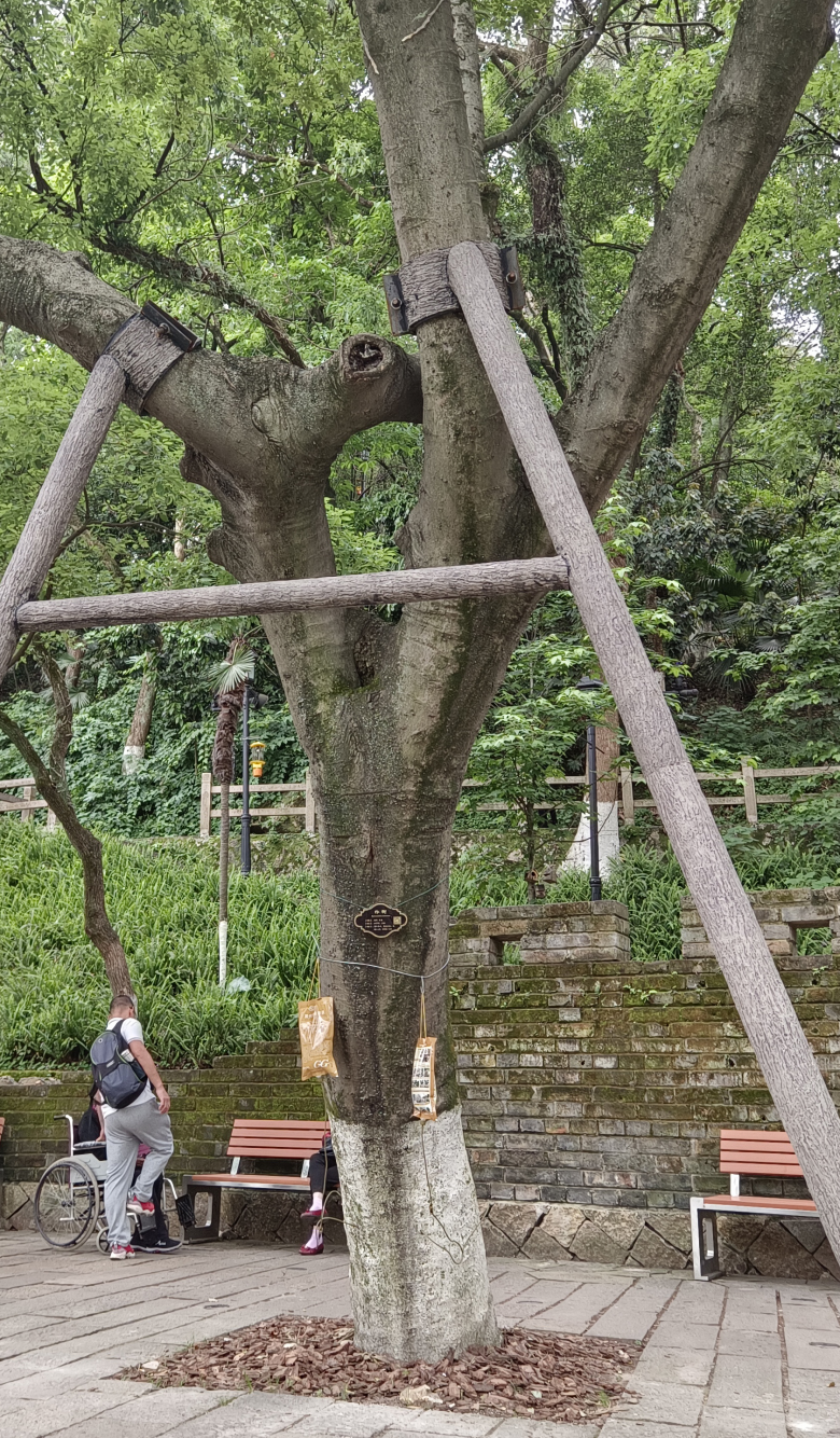 此外记者还发现,有部分树的枝干被裁剪,其中一棵朴树发生明显倾斜,被一个木制支架支撑着。公园一名管理人员告诉记者,这些树的“健康”状况不太好,这几天特地请来杭州的植物专家给它们“会诊”,正在想办法给这些大树进行治疗。