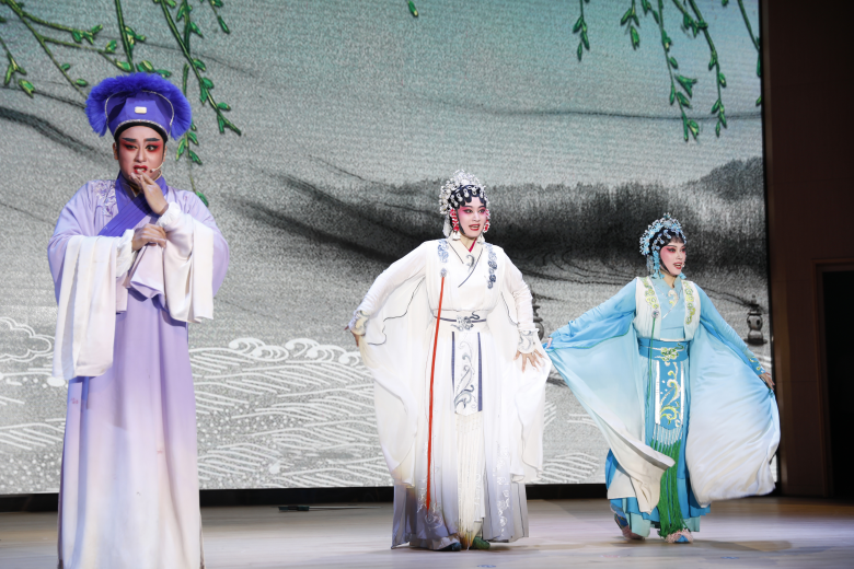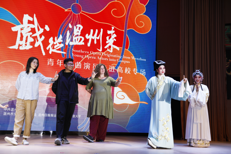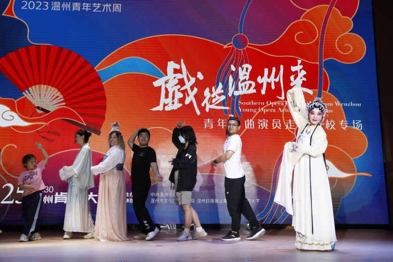 温都讯 5月25日晚,“青春艺起来”2023温州青年艺术周重要活动——“戏从温州来”青年戏曲演员走进高校专场在温州肯恩大学举行,来自市越剧院、市瓯剧艺术研究院等剧团的戏曲演员们为在温高校中外师生和温州市民共500余人展示了别样精彩的温州戏曲文化,助推中外文化交流。