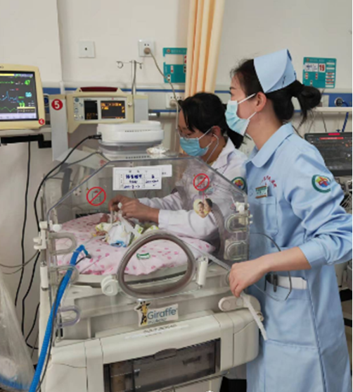 叶艳艳副主任医师、胡阿萍主管护师为危重早产儿进行日常治疗、护理
