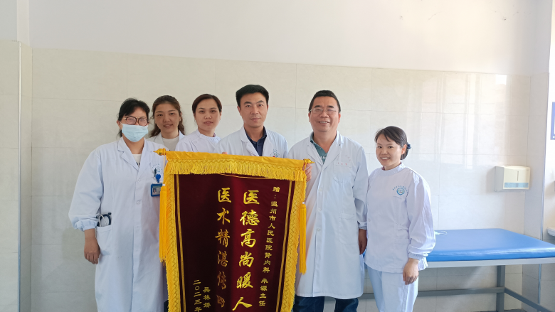 事情是这样的:泰顺56岁的吴女士患糖尿病20余年,但她看病不规律,没有按医嘱服药,当出现恶心、乏力、水肿等症状时,到医院查血肌酐已达500μmol/L以上,确诊为终末期肾脏病,即尿毒症。吴女士如晴天霹雳,一时间难以接受这个事实,甚至产生了不想医治的想法。为了缓解她的焦虑,朱源医生给予安慰并耐心讲解病情以及下一步透析治疗计划,鼓励她积极面对病情和生活。经充分评估并与吴女士详细沟通,朱医生建议她选择腹膜透析作为肾脏替代治疗方式。在医护团队的帮助下,吴女士顺利完成了腹膜透析置管手术,开始居家腹膜透析,病情日趋稳定,生活也逐渐恢复正常。在多次沟通过程中,吴女士被朱源医生的精湛医术、诚恳态度、敬业精神所打动,于是她和家人专程给朱源医生送上一面写着 “医德高尚暖人心、医术精湛传四方”的旗锦以表谢意。