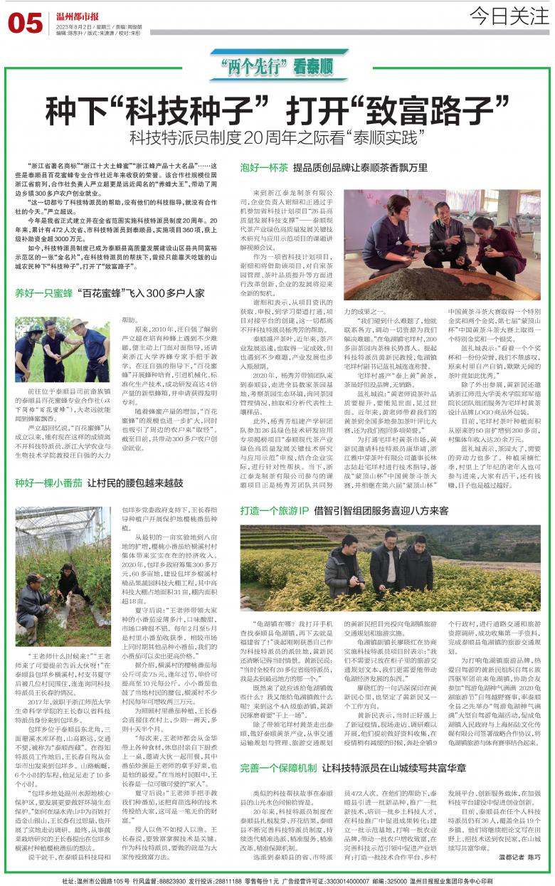 如今,科技特派员制度已成为泰顺县高质量发展建设山区县共同富裕示范区的一张“金名片”,在科技特派员的帮扶下,曾经只能靠天吃饭的山城农民种下“科技种子”,打开了“致富路子”。