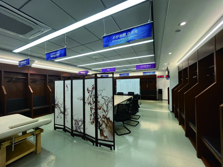 每个休息室内有29个更衣座位,此外还配备了按摩椅、战术板、冰柜、饮水机、卫生间、淋浴房等设备。竞赛综合事务组主任李一箴告诉记者,场馆已配置完整的基本设施,在开赛前,每支队伍都会有专门的工作人员提前来到场馆,将本队队员的物品先行放置在休息室内。